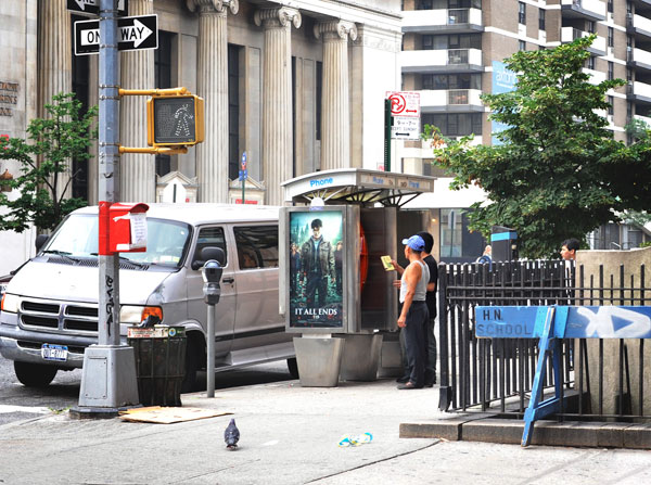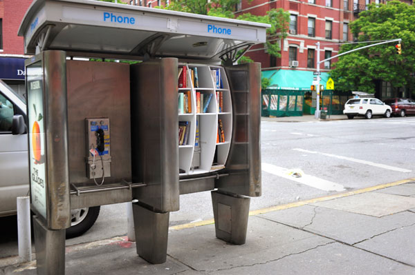 John Locke: Basically the project, and DUB, began by identifying and trying to exploit potentially underused streetscape spaces. In other words, the first place I looked was the phone booths that litter my neighborhood. I consider the booths a detriment to the urban experience in that, spatially, they both reduce the available sidewalk width and they also occupy the street as pedestrian level billboards. And of course, in a world of ubiquitous mobile communication devices, their original function has disappeared. Most neighborhoods in lower Manhattan have very little phone booth coverage, but here, where I live in Morningside Heights, they are surprisingly common; some streets have as many as five booths on one block. So, the project really began with that idea of how can we turn something obsolete and a net negative for the neighborhood into something worthwhile that would hopefully encourage community involvement and provide a sense of connection with neighbors over something shared.