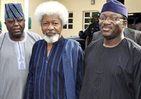 LEFT: Femi Osofisan (Okinba Launko), a Nigerian playwright, poet, translator, critic, and theorist of literature, is also a regular columnist in Nigeria's leading newspapers. http://femiosofisan.org RIGHT: Nobel laureate Wole Soyinka, flanked by Ekiti State governor Kayode Fayemi (right) and Yemi Ogunbiyi (left) / NBF News, www.nigerianbestforum.com, February 8, 2011