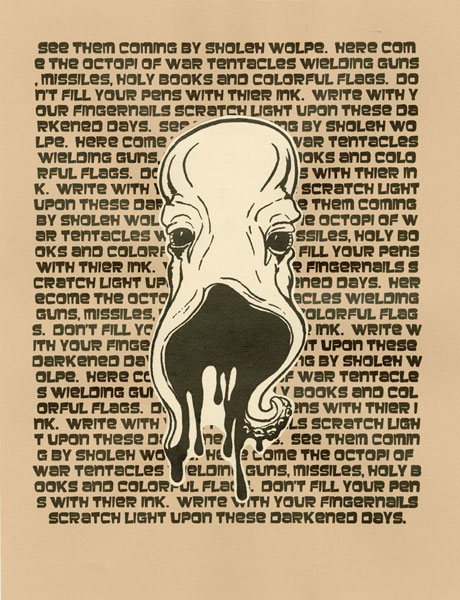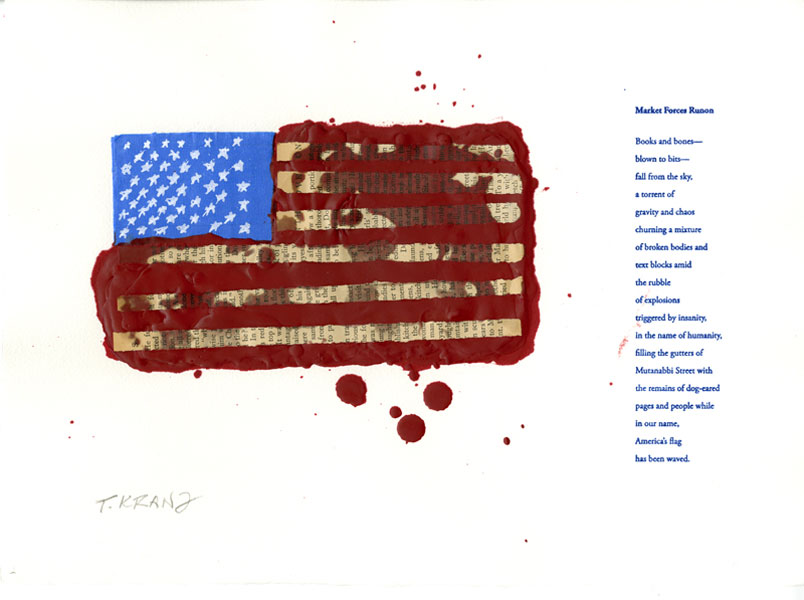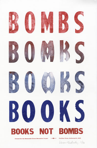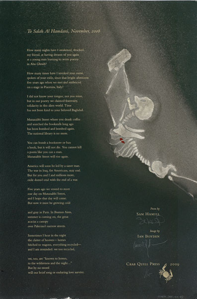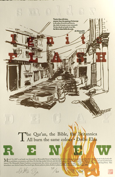 "What started as a call for poets and writers to write and read poems in April 2007 in memory of those who lost their lives on Al-Mutanabbi Street quickly morphed into a call to letterpress printers to produce a visual response to the attack. The response Beausoleil received was immediate and overwhelming, with over forty letterpress printers responding with powerful and evocative broadsides based on their responses to the bombing or incorporating poems written about the war or the Al-Mutanabbi bombing itself."—Persis M. Karim, "[node:673,title="A Day That Lingers with Us Still:Al-Mutanabbi Street Starts Here"]"