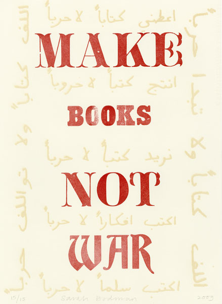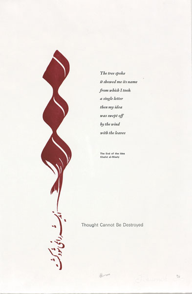 These ten letterpress prints are just a small sampling from a large digital collection of Al-Mutanabbi Street broadsides from the Jaffe Center for Book Arts/Florida Atlantic University Libraries. To read more about the broadsides, view the historic suite of 133 printed literary broadsides, or search by title, artist, or author, visit the JCBA at http://www.library.fau.edu/depts/spc/JaffeCenter/collection/al-mutanabbi/index.php.