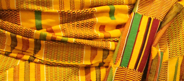 The kente cloth is a genuine Sikafuturo (“Gold dust”) fabric, woven from pure silk yarn by a master craftsman in a town called Bonwire, which is the original home of the kente and still the center of kente weaving in Ashanti. The Sikafuturo is one of the oldest designs and, in the early days, was only worn by kings, since it actually represented gold dust, which was the monetary currency and source of power of the Ashanti nation. It was made for me in 1969, but I only wear it on the most “esteemed” occasions.