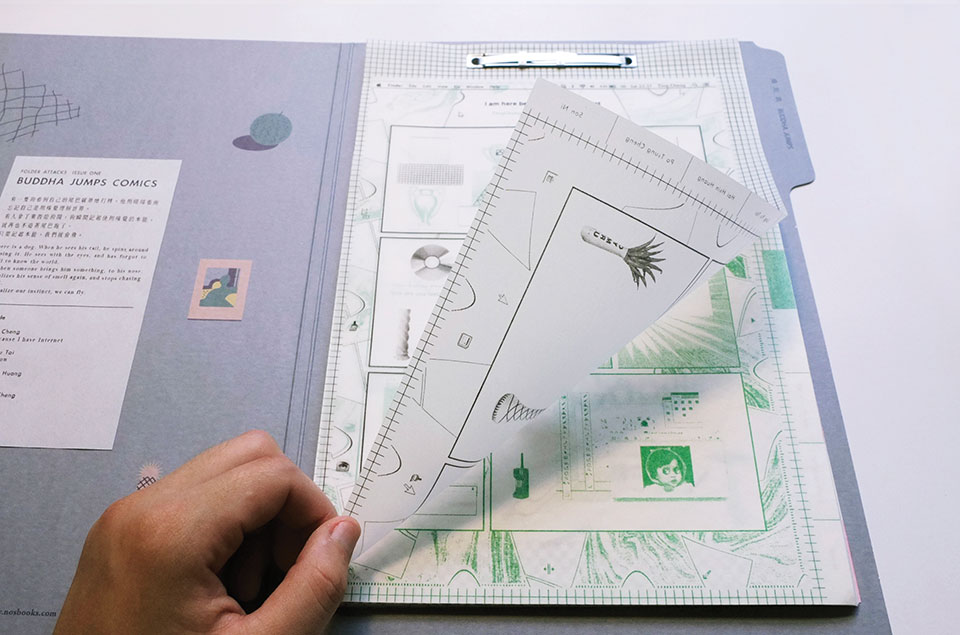 But at the tail end of my visit to the 2014 fair, I paused at a spare table of small, minimalistically designed books, and a unique object caught my eye: a gray file folder decorated with geometric images. My eye wandered over the four pieces of text on the cover: Folder Attacks / Issue One / Buddha Jumps / Comics. “Comics” nailed my eye to the book (this has happened before), and I reached out and opened it. Folder Attacks: Issue One, subtitled Buddha Jumps, is unlike any comics anthology I’d ever seen before. The book functions precisely like a file folder, with a metal clip fastener across the top, binding into the folder pages that must be flipped upward to be read in succession. If the clip-and-flip binding proceeds functionally from the file-folder format, its possibilities push deeper into groundbreaking aesthetic territory. The pages alternate between transparent and opaque, with graphic elements on each layer that first function in concert, then separately as the pages turn. More than a year later I continue to be intrigued by this unique and rare object.
