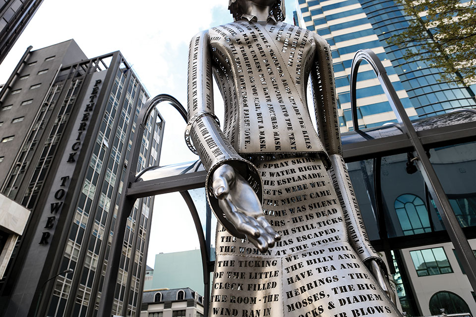 Katherine Mansfield casts a long shadow. In stories such as “Prelude,” “The Garden Party,” and “At the Bay.” In the restored Katherine Mansfield House and Garden where she spent her early years. In Woman of Words, the three-meter-high sculpture laser-cut with her words and phrases, depicting her striding along Lambton Quay. In her featured words, among those of twenty-three writers on the Wellington Writers Walk.