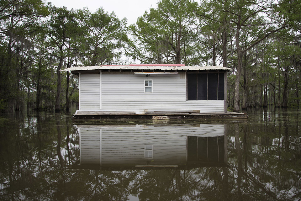 Virginia Hanusik’s work dissects the relationship between landscape, culture, and the environment. Her photo series titled A Receding Coast examines South Louisiana, which is experiencing rapid coastal erosion, losing land the size of a football field every thirty minutes. Her photos examine the history of building practices and architectural adaptation in southeast Louisiana, showing an American landscape that may soon be completely underwater.