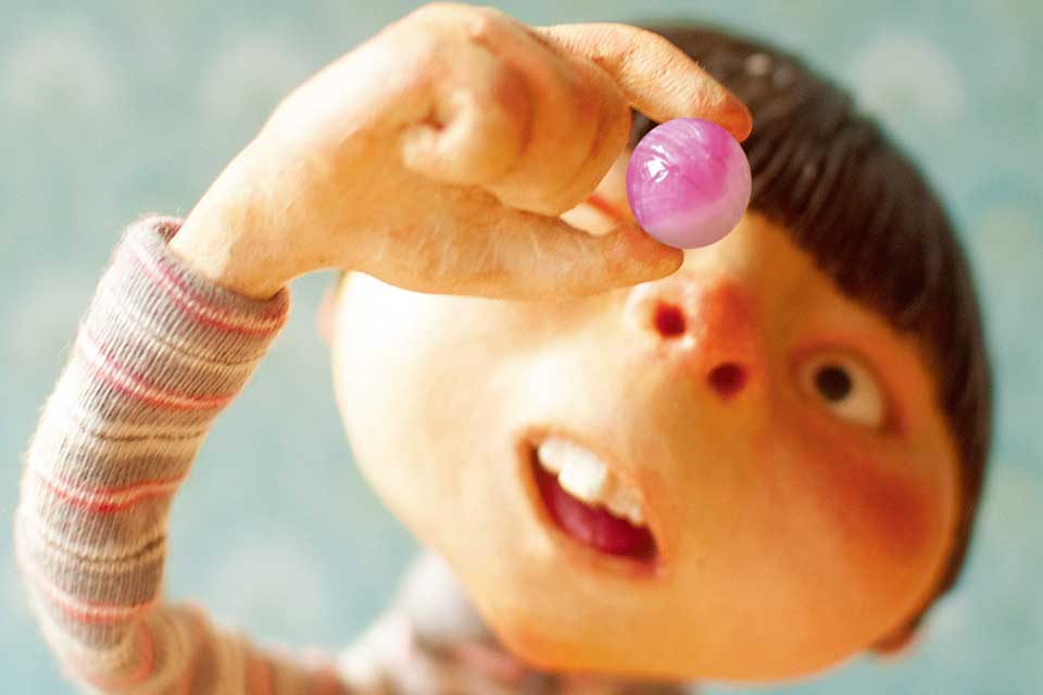 Tong Tong plays on his own or with his dog, Marbles. How do you ever know what the other kids are thinking, and how do you start a conversation when you’re painfully shy? All that changes one day when Tong Tong comes home from the store with a bag of special candies. Varied in their patterns, colors, and flavors, each candy opens his ears to the inner voice of someone, or something, he didn’t expect to hear from! “Over here, over here,” he hears the sofa call, begging him to fish the remote control out of an uncomfortable spot and to please ask his dad to give the farting a rest. Tong Tong’s facial expression is priceless, as is the heart-warming moment when he is privy to Dad’s inner thoughts. Out loud, all he hears from Dad is endless nagging, but when Tong Tong has a sneaky candy under the covers in bed, he is surprised by the repeated refrain of “I love you” coming from Dad silently washing the dishes in the kitchen. This journey of realizing how much he is appreciated lifts him in confidence, until the very last candy in the bag. It remains quiet no matter how much he sucks it. Maybe it’s Tong Tong’s turn to speak up and utter his inner thoughts: “Do you want to play with me?” Like stills from an animation, Baek’s illustrations are photographs of her intricate miniature models, all crafted with astonishing detail and character. Baek has published thirteen picture books, all with unusual approaches to illustration, but this is only the second to appear in English. May it be the start of many.