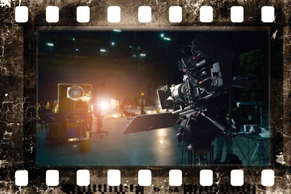A photograph of a camera on the set of a film. The borders are styled to look like a piece of analog film