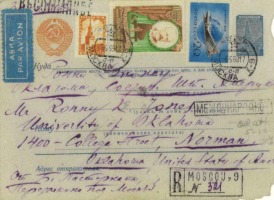 In August 2021 University of Oklahoma alumnus Ron K. Jones donated a letter that he had received in 1959 from Boris Pasternak (1890–1960) to OU Libraries’ Western History Collections. In October 1958 Pasternak had been awarded the Nobel Prize in Literature but, under pressure from Soviet premier Nikita Khrushchev and the Union of Soviet Writers, declined to accept it. WLT is proud to publish Pasternak’s 1959 letter here for the first time along with a note by Nicolas Pasternak Slater, Mr. Pasternak’s nephew.