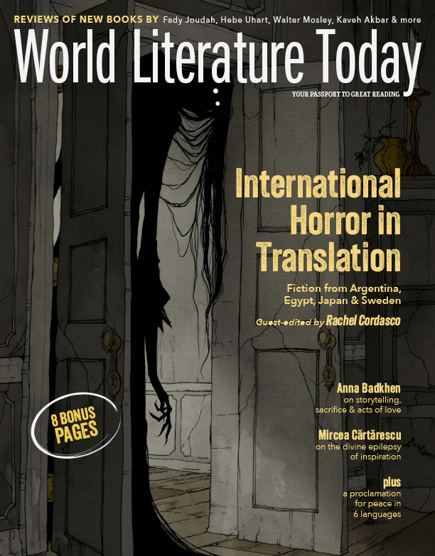 With eight bonus pages and cover art by Abigail Larson, the July 2024 issue of World Literature Today presents International Horror Fiction in Translation, guest-edited by Rachel Cordasco. The cover feature gathers stories by Junko Mase (Japan), C. E. Feiling (Argentina), Mahmoud Fikry (Egypt), and John Ajvide Lindqvist (Sweden), plus a reading list by Jess Nevins and online interview with Megan McDowell. Additional highlights include a conversation with 2024 Dublin Literary Award winner Mircea Cărtărescu; an essay on storytelling, sacrifice, and acts of love by Anna Badkhen; Gloria Blizzard’s “History of Canada” booklist; and Kim Stafford’s “Proclamation for Peace” poem in eight languages. The book review section rounds up the best new books from around the world, and additional interviews, poetry, and essays offer indispensable summer reading.