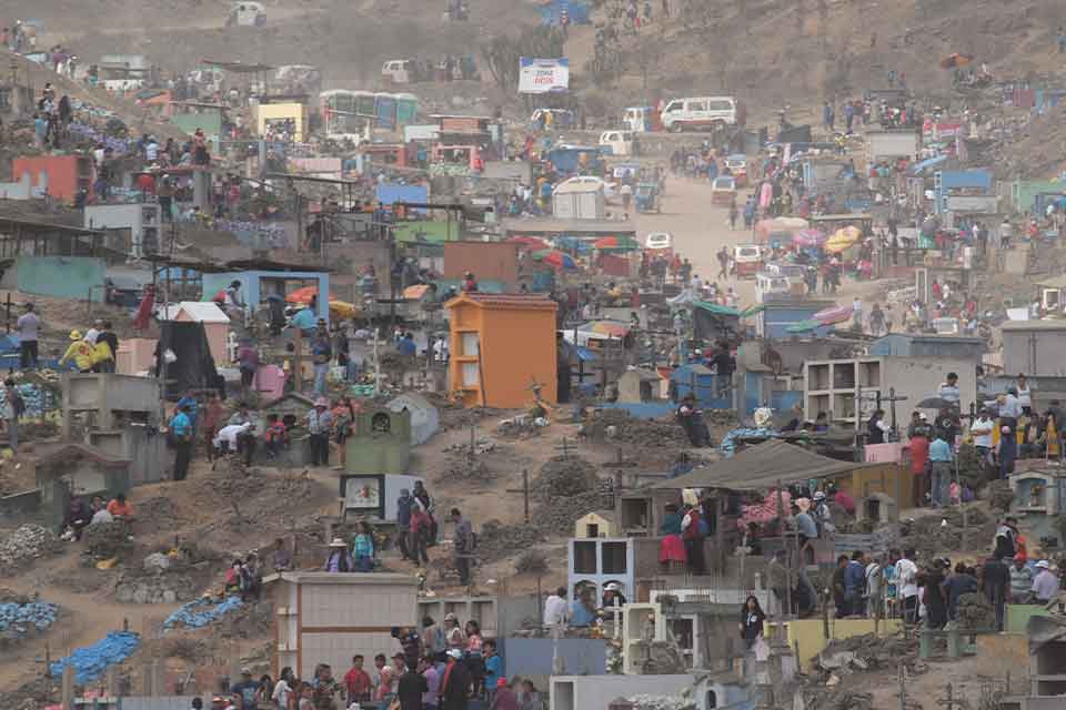 The cemetery is called Mártires del 19 de Julio, also known as Belaúnde, and it’s as big as fifty soccer fields put together. Seen from above, the squatter settlement Carmen Alto, in the district of Comas in Lima—with its soccer pitches, mototaxis, stores, buses, and houses on the slopes of its hills—blends with the hundreds of tombs and niches that have been accumulating here since the 1960s: when entire families came from the Andes to the capital and founded districts that today form the so-called Conos.
