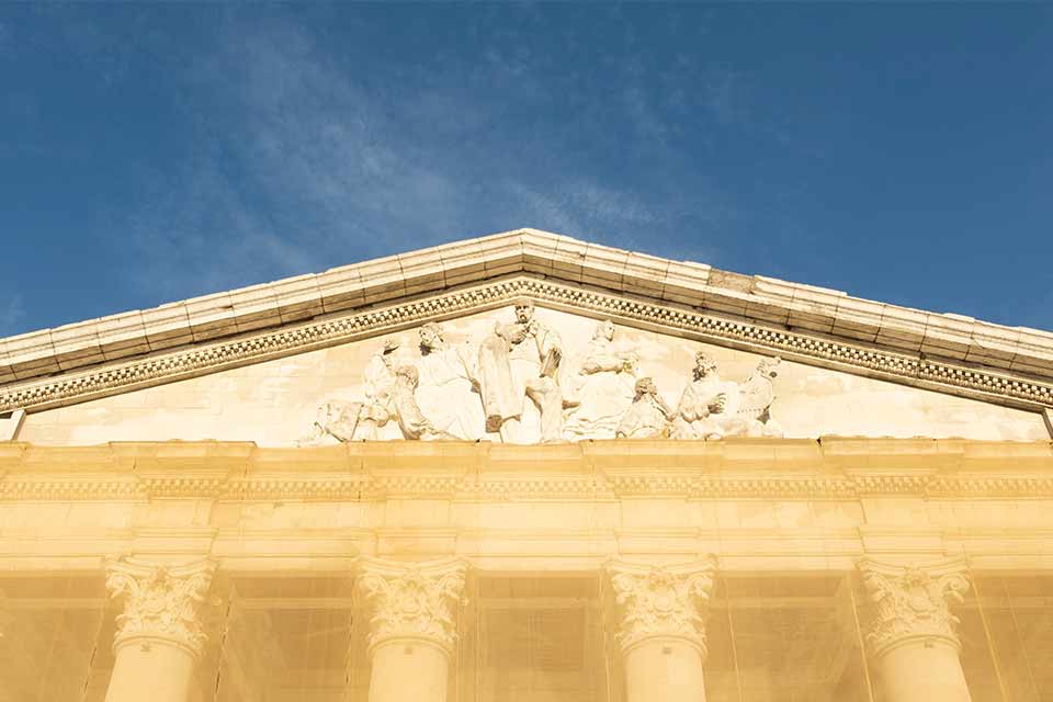 A photograph of a detail near the roofline of an aged marble building. The area has a relief sculpted into including several historical and mythological figures, including Joseph Conrad