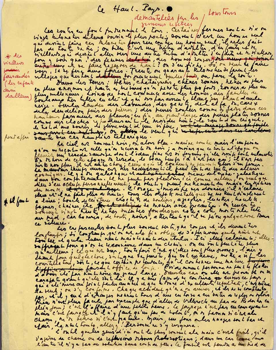 Sensual and torrential are adjectives used routinely to describe Giono’s style. This “raw,” seemingly unfinished language, which sweeps along in an extraordinary profusion of details, is borne by accurate and detailed observation. French scholar Emmanuelle Lambert calls Giono’s language artisanal because of the quality and details of his descriptions and, “galloping” à la Stendhal, breathless, without a superfluous word.[11]