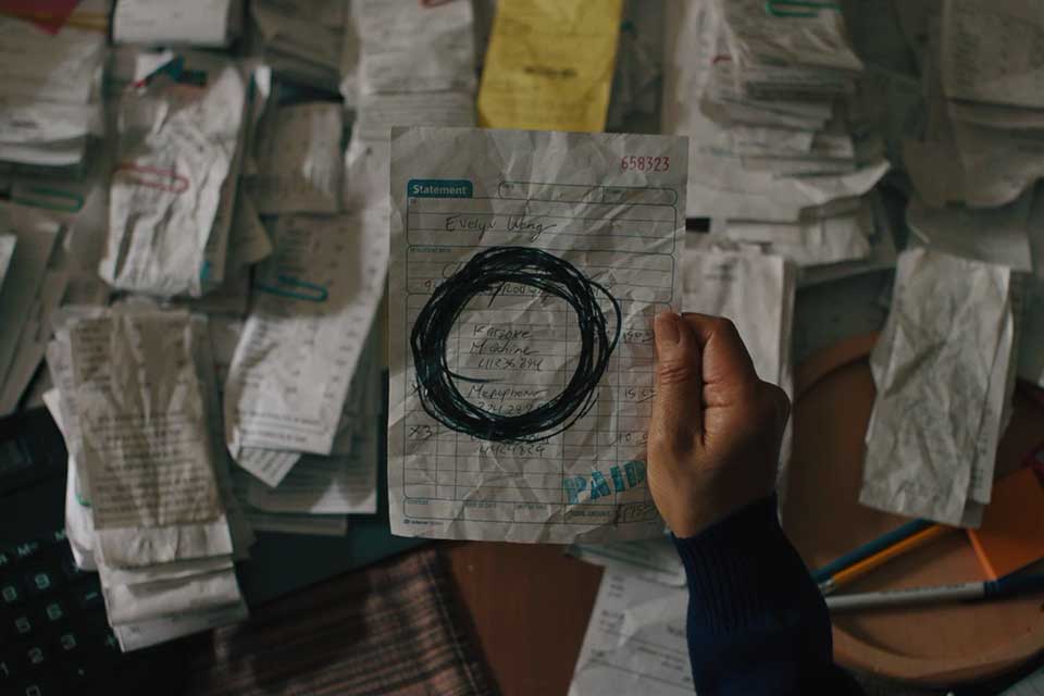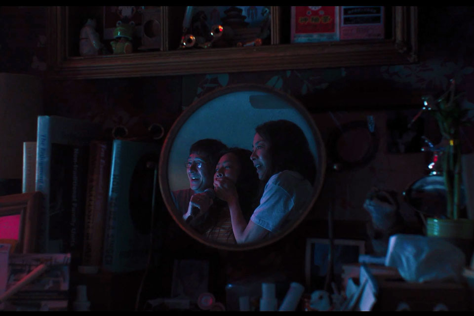 An exhausted, middle-aged Chinese American woman who is a laundromat owner, Evelyn Wang (Michelle Yeoh), is swamped with a number of ongoing problems all at once: tax audit, unhappy marriage, her daughter’s queer sexuality, a conservative and demanding father who is visiting and knows little English, and stressful Lunar Chinese New Year party preparations. Evelyn discovers that her decisions in the past bring parallel universes into existence; as the chosen one to prevent the most powerful evil being from annihilating life throughout the multiverse, she must fight back by traveling across the universes to connect her other selves. The most compelling visual sign of Evelyn’s chaotic life is the circle, around and for which EEAAO structures itself as a narrative of fixing and filling up. The onset of the story is a circular mirror reflecting three characters: Evelyn, Waymond (Ke Huy Quan), and their daughter, Joy (Stephanie Hsu). It is an illusion of family happiness through the looking glass, darkly. Then, more circles show up and establish diegetic (inside the film world) connections. Evelyn’s prime universe inside a dark hole, as big as the spinning circle of a washing machine in her laundromat, in an extreme closeup shot, embodies what seems to devour this unlikely heroine’s professional and family lives at once. Dark circles drawn by IRS auditor Deirdre (Jamie Lee Curtis) on Evelyn’s tax paperwork point to the unpluggable drain hole of the immigrant family’s business. Another circular mirror appears to be a displaced one, projecting Evelyn’s anxious face and split body/soul oscillating between her prime universe and other parallel universes. The circle has no end and yet offers a liminal space.