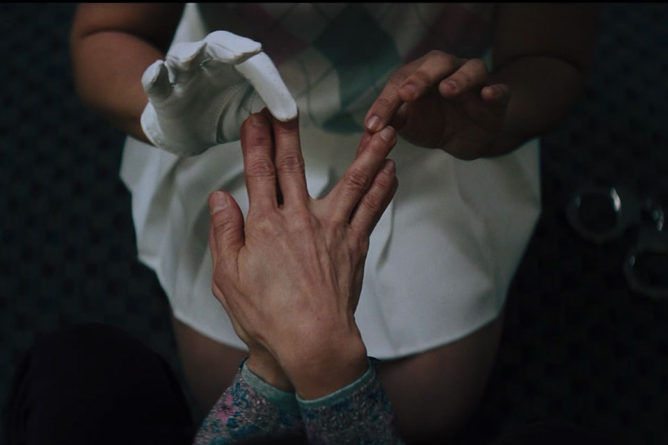 For example, female/family bonding is built on the subtle working of a hand-to-hand motif literally staged in the confrontation scene. The key moment occurs right after Evelyn’s handcuffs unlock automatically when she randomly jumps into the hot-dog-finger universe for the first time and switches back. Joy/Jobu Tupaki opens Evelyn’s middle finger and ring finger by inserting her own hands (the right one still in a white glove) into the space, between which the everything bagel is made visible. From Evelyn’s perspective, we see the bagel through the space between their fingers and, disorientingly, also between the overlapping palms of their hands. The film’s dark secret exposes itself through the exchange of the two female characters’ point-of-view shots framed by hands and fingers. Central to the scene is a sense of symbiotic intimacy that emerges from mutual collision in the most straightforwardly embodied and tactile way. The boundary between mother and daughter, good and evil, powerful and powerless, manipulation and freedom, is blurred.