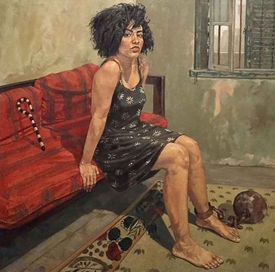 The opposite of freedom features prominently in the parable-paintings of Ebeid, in the form of blindfolds, bars, handcuffs, chains, and, generally, circumstances that bind. A student of Egypt’s illustrious history, one of his works is titled Nefertari, Once Again. Ebeid’s rendering of the great Egyptian queen is a far cry from her typically lavish depiction. This modern Nefertari has fallen on hard times, sitting uneasily on the edge of a sofa, in squalid surroundings. Her royal staff, like her, is diminished and rests like a futile child’s toy on the worn cushions next to her. To underscore her appalling condition, there is a ball and chain fixed to her left ankle. The fallen monarch stares directly at the viewer, reproachfully. What have you learned from our past, she might ask. Where is our ancient wisdom?