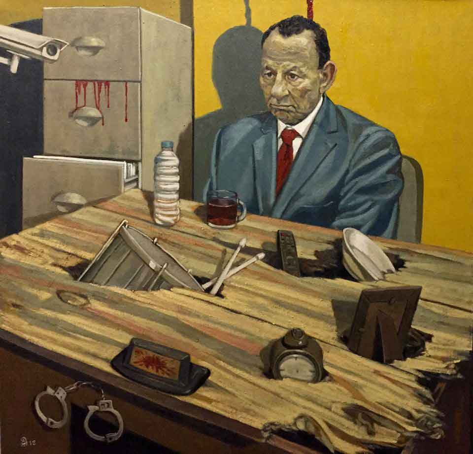 An unsettling example of one systematically broken and barely unexploded is Ebeid’s Settled Citizen. If the vacant, extinguished look in the eyes of this citizen were not enough to betray his condition, his bomb-site of an office hints at a lifetime of disappointments that surround him like shrapnel. While his teacup and water bottle sit upright as he does, his suit and tie are more vibrant than the hollow man inside them. All the symbols of what might sustain, entertain, and distract him crash through the splintered wood of his tomb-desk: a soup bowl, a picture frame, a drum kit, remote control, and clock. To add insult to injury, a surveillance camera makes public his private humiliation. The handcuffs that hang from his desk do not appear to be needed. Is the blood dripping from the filing cabinet his own, sapped by this office? And does his shadow betray a noose around his neck? The so-called settled citizen reminds one of Melville’s miniature masterpiece, “Bartleby the Scrivener,” an ode to the patron saint of civil servants, the dispirited automatons of an absurd workplace. In Eliot’s “Prufrock,” these are all who “measure out their lives in coffee spoons” in demoralizing circumstances, performing tedious tasks that they would prefer not to.