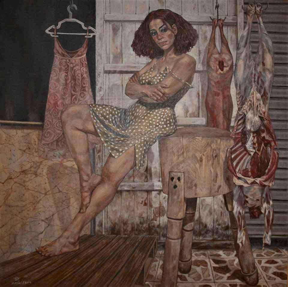 Allowed Meat is a complex painting by Ebeid that has it both ways. The scantily clad, barefoot heroine poses seductively in an unglamorous surrounding, a butcher shop, flanked by animal carcasses. Her ashen skin is rendered as unsentimentally as the animal flesh around her, à la Lucian Freud by way of Francis Bacon. Is the dress on the coat hanger a metaphor for the fiery redhead, dangling on a hook, offering her wares? Is that a come-hither look she wears, or is she lost in reverie or regret? Is the voluptuous female seated on the cutting block availing herself to be ravaged, consensually, by a lover or resigned awaiting a customer? What is allowed in this meat shop: only raw carnal desire? What about Love? Is this a portrait of empowerment, defilement, or both?
