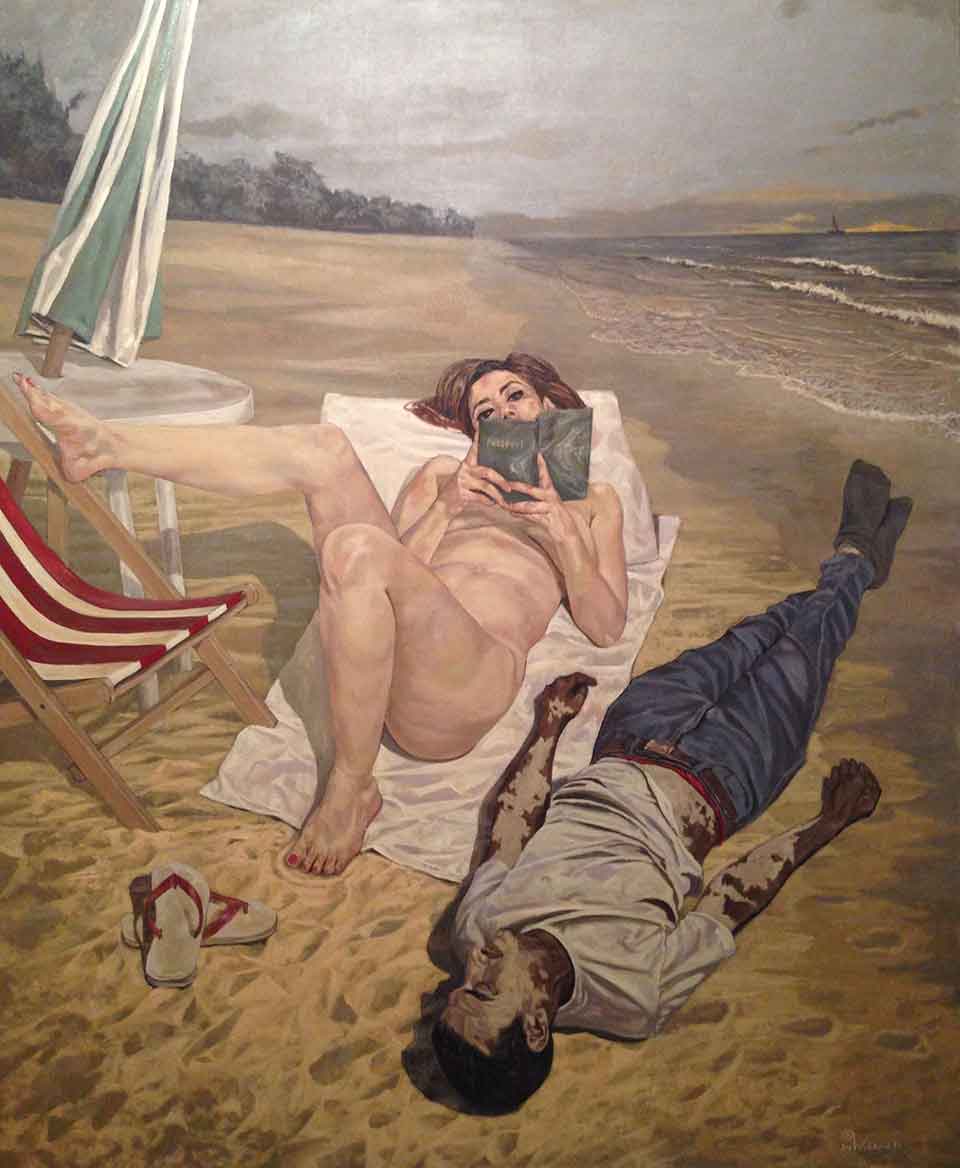 Addressing one of the great moral issues of our time, the refugee crisis in which tens of thousands of unfortunate souls drowned in the Mediterranean, Ebeid commented: “People who feel like strangers in their own countries seeking for a better life in other places where they will realize that they are more strange.” His painting The Immigrant is a kind of shock art, intended to shake us out of complacency. Reversing roles, and expectations, it depicts a fully clothed man (washed up onshore?) lying next to a naked woman at the beach. He is lifeless and discolored, she pale and languid. One of the nudist’s legs is raised, idly—like a cat’s tail twitching on a lazy summer day. It appears that the woman is reading a book, but upon closer inspection, it turns out to be a passport. This is angry, indignant art, laced with defiance and a strange eroticism. But the true obscenity that such a challenging painting suggests is indifference to the pain of Others.