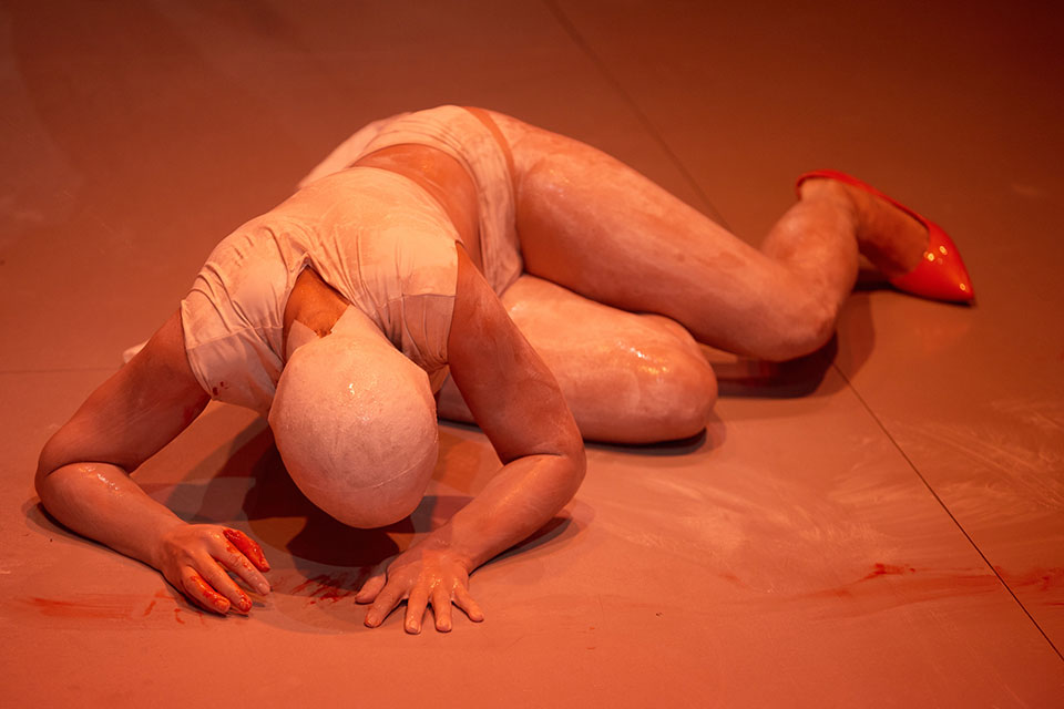 She appears in a monumental outfit that fills the entire table, her gestures are wide, her movements slow. First, we see her wearing an impeccable wig, then she’s ruined, wearing the red shoe only on her right foot, her clothes are dirty, her wig tousled, and she speaks obscenities.