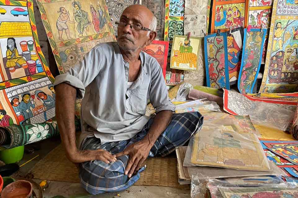 I nod. I already know the artisans make a range of products beyond the scrolls, as I bought T-shirts and face masks and items for home décor with Patachitra motifs from Susama in Delhi. Patachitra received the Geographical Indication (GI) tag, and the government of West Bengal’s Department of Micro, Small, and Medium Enterprises & Textiles, in association with UNESCO, developed a rural craft hub in Pingla.