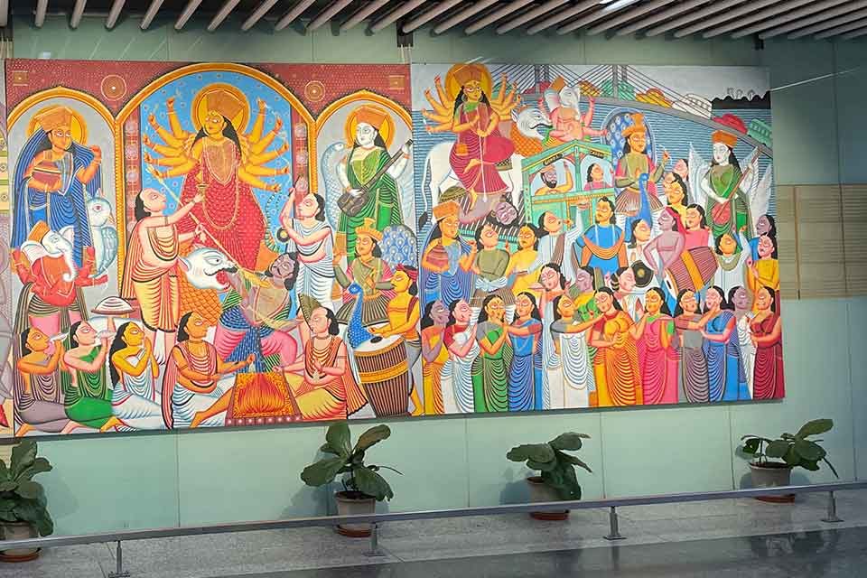 Although the precise origin of this art form is undocumented, Chitrakars and their art form can historically be traced back to the thirteenth century. Some Chitrakars claim an ancestry that stretches to the artists of cave paintings in the region. The skill of Patachitra is the pride of Bengal; on arrival at the Kolkata airport, people see a huge mural in this style, and the heritage hotel I stayed at had a room styled in this art form.