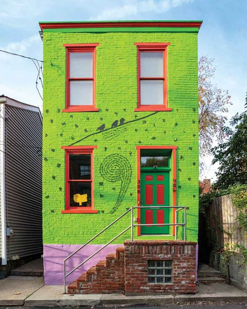 On the front of the house, the artwork includes one of my Bengali poems in the shape of a giant comma. The text on the house is actually three-dimensional, as the letters and numbers on the house are made of aluminum and are not flat against the surface. I selected the shape of a comma because, as we know, commas link or join multiple sentences, thoughts, ideas, and by utilizing a comma here, I celebrate the linking and joining of people who come to enjoy the art on Sampsonia Way. Also, commas are a physical indicator of a pause or time of waiting, just like the exiled writers of the sanctuary program who are waiting to receive asylum and progress in the immigration process. I added a yellow drawing in the bottom left window, which depicts the pain I feel because of being unable to return home these past six years.