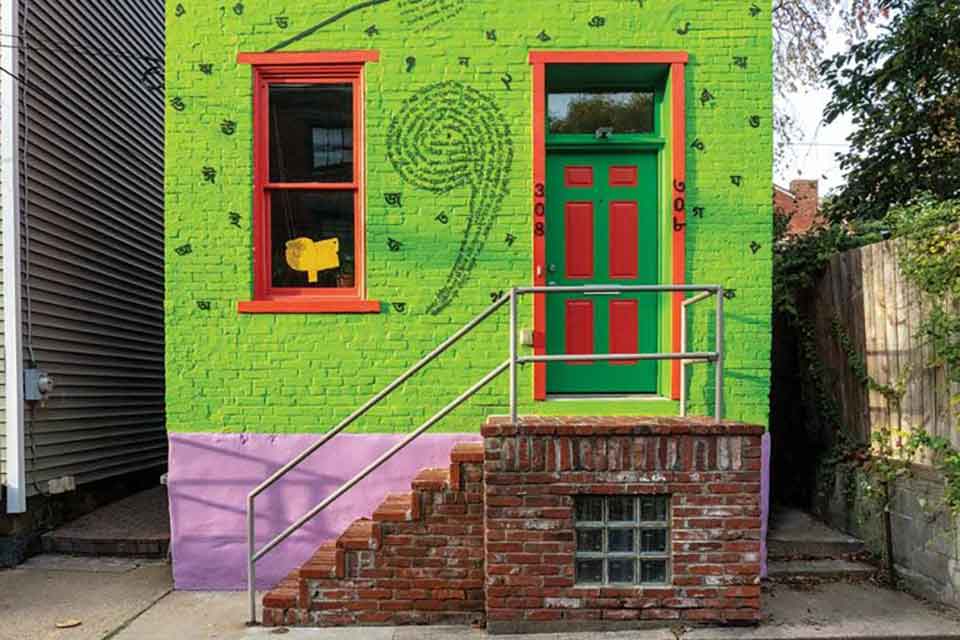 Das: This house is titled the “Comma House,” as the main poem featured on the house is entitled “Keeping You Waiting with a Comma.” The house is primarily painted green and red, which are the colors of the national flag of Bangladesh. Green is representative of Bangladesh’s fertile land, and red recognizes the people murdered in Bangladesh’s Liberation War against Pakistan in 1971. The bottom portion is painted purple, which signifies the water lilies grown throughout south central Bangladesh, in the region where I am from. I have a lot of memories from my childhood of the water lilies growing—we would go to the ponds and pick water lilies, take them home to cook, and then eat them. The robins included in the mural remind me of the birds I saw on April 2, 2016, when I looked up at the electrical wire when I first arrived. It felt as though they were my first friends, here to welcome me to my new home. That night I wrote a poem about those birds; this was my first writing in my new home and expressed my first impression of Sampsonia Way.