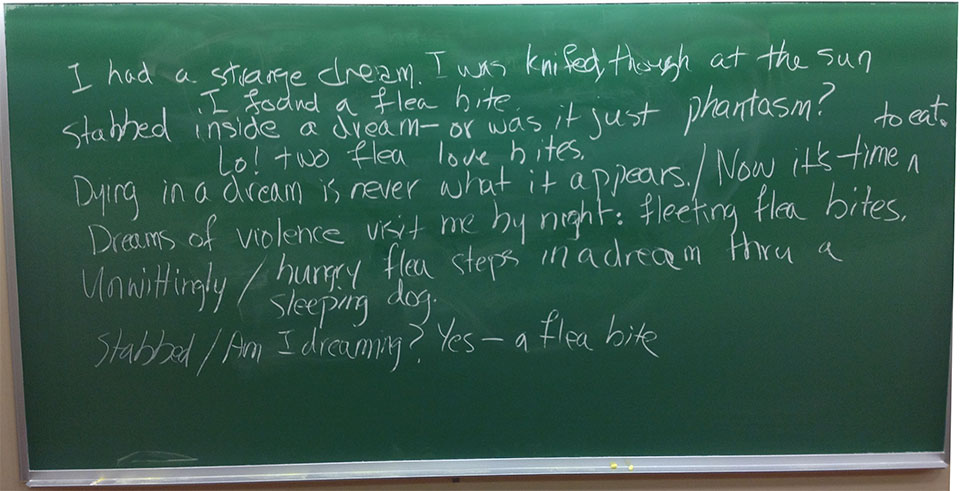 KH: I am about to do so next week in my craft class: I love to take The Classic Tradition of Haiku, an anthology edited by Faubion Bowers ($3 Dover edition!), and have the students select one haiku that has several translations. With these and the transliteration, they must come up with their own. And they are welcome to be outrageous.
