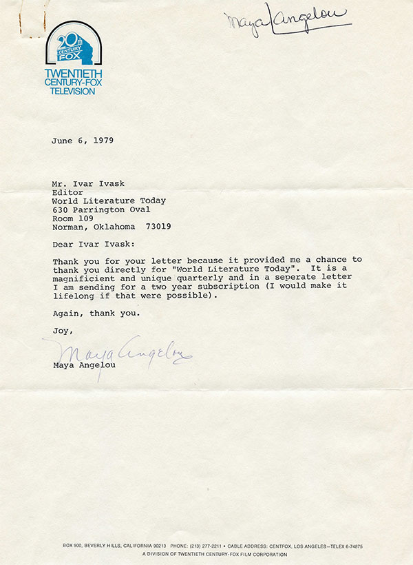 As the United States Postal Service hosts a stamp dedication event tomorrow in Washington, DC, for the release of their Maya Angelou Forever stamp, we’re delighted to share images of the new stamp as well as this handwritten letter that Angelou sent to World Literature Today in 1979, which was known as Books Abroad until 1976.