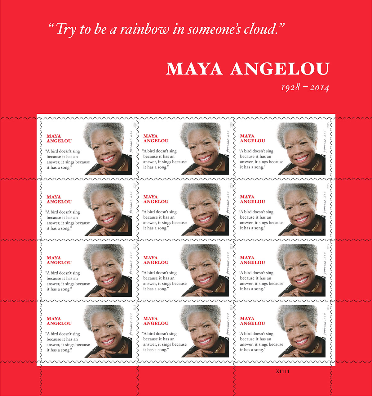 The stamp pane includes a short excerpt from Angelou’s book Letter to My Daughter. It reads: “Try to be a rainbow in someone’s cloud.” Art director Ethel Kessler of Bethesda, MD, designed the stamp.