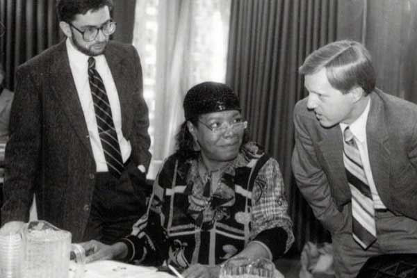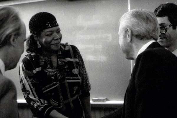 The editors and staff of World Literature Today join in mourning the passing while celebrating the life and literary legacy of Maya Angelou, who died earlier today at her home in Winston-Salem, North Carolina, at the age of eighty-six. Dr. Angelou was a visiting lecturer at the University of Oklahoma and one of ten members of the jury that chose the winner of the 1986 Neustadt International Prize for Literature, sponsored by WLT. Her nominee for the 1986 award was Nigerian dramatist, poet, novelist, and critic Wole Soyinka (b. 1934), who went on to win the Nobel Prize in Literature later that year. The accompanying photo gallery features other members of the Neustadt Prize jury, which convened on the Norman campus in February 1986. A review of Angelou’s Collected Poems is reprinted below. – Daniel Simon, Editor in Chief