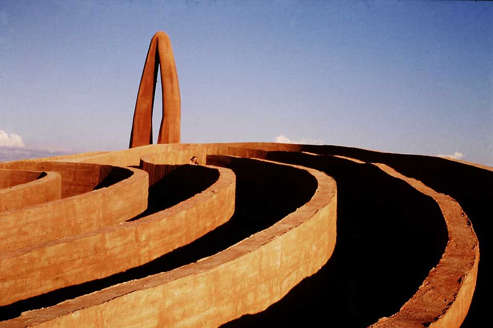 In the mid-1970s, Lanfredini’s sculptures acquired a broader dimension and began to relate more closely to their surrounding spaces. Privileging interactive artworks that dialogued with the places where they were placed, he made places of transit and erring such as thresholds, labyrinths, gates, and gardens that were designed to be crossed and experienced. His most famous work of the 1980s is Ariadne’s Labyrinth (Labirinto di Arianna), which was selected by the International Competition of Sculptures promoted by Antonio Presti, the creator of the Fiumara d’Arte open-air museum on the northern coast of Sicily in Catana. There, in 1988–1989, on the high cape of the Nebrodi Mountains, above the village of Castel di Lucio, Lanfredini painted and burnished cement. The labyrinth’s meditative impact has inspired documentaries by Italian state television RAI and the European channel Arte since 1989. The Chilean producer Raul Ruiz filmed in it a part of his surrealistic movie The Clandestine Journey: Lives of Saints and Sinners. By associating himself with this project, Lanfredini affirmed his desire to heal the land and reclaim a forsaken area of Sicily, even if it meant becoming part of a controversial project that only after twenty-five years of court battles was recently recognized as a national artistic treasure.