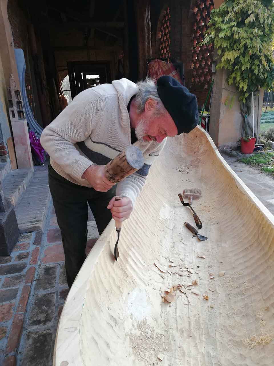 Lanfredini’s current work-in-progress, The Canoe (Piroga), is a metaphorical bottle afloat in the sea. Carved from a centenary poplar trunk, it features in its center a “jewel case” containing poems on the theme of sea and love. Once installed on fifty to sixty square meters of wood chips sculpted from the tree trunk, the piroga will “travel” to the four corners of the globe on these “waves” with the help of “sails” formed by the poems strung from the piroga. Lanfredini explains: