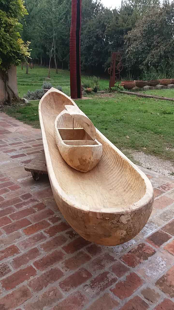 The alliance between music, poetry, and sculpture is a trademark of Lanfredini’s mature work. Poetry for him has its roots in nature and in the dawn of humankind, as birdsongs were an inspiration for the human voice. He always returns in spirit to the origins of the poetic word. Listening has always been very important to him. Whether nature’s breath, birdsong, human speech or jazz, classical music, pop, or cantautorale, sound helps him decipher space and give his work its tempo. Sounds, but also silence, for those who listen, see. The musical pieces accompanying his works are often written for that specific work; they are a part of a sculpture and, like poetry, create an additional space for reflection and imagination. The first work accompanied by music was The Sieve. This practice continued with the “piroga” series that characterizes his recent work. Not unlike the Bantu people of Africa or the Native Americans of North America, he carved canoes out of tree trunks, in his case centenary elms that had succumbed to Dutch-elm-disease. This caused one of the participants to his newest project, poet Stuart Dybek, to liken the piroga to “a boat that has floated hidden for years within the tree.”