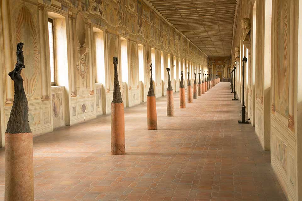 The first piroga, called The Cradle of the Wind (Culla del vento), was made in 1992/93. A canoe carved from a single tree trunk rests atop a wooden ladder. In it are thirty-seven terra-cotta tiles inscribed with texts by writers, musicians, philosophers, and poets. These texts are given to posterity, to be revealed only after Lanfredini’s death. The secret acts as an imagination-trigger, as it projects the viewer into the future and encourages a reflection on the imperfectability of knowledge. A second canoe, The Boat of Precious Essences: Verses to Pour – Whistles to Dream, is located in the deconsecrated fifteenth-century church of San Pietro in Gazzuolo. The work was presented by the poet Alberto Cappi, who enlisted several Italian and international poets. The piroga rests on a bed of wood chips, which give off the sound of water when walked upon; located in the nave, it carries thirty-six terra-cotta vases, each containing a poem, and eighty whistles dedicated to children. In both works, the echoes of invisible words and sounds bring about a sense of mystery and reinforces the invisible presence of the sacred.
