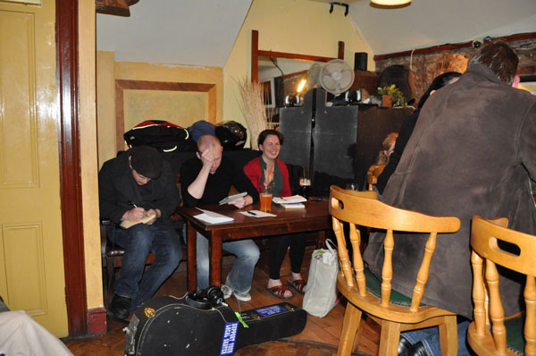 The emcee took to the mic and managed to quiet the room after five or six attempts. She explained that Ó Bhéal started their evenings with a contest for the best poem written on the spot. Then she solicited “five random words” from the audience—socks, gluttony, spring, absurd, and driving—and gave fifteen minutes for people to write poems. I imagined only a few would do this, but the crowd went silent. Poets of all ages bent over notebooks. The average age hovered around forty, I thought, yet college kids and grandmothers scribbled side by side.