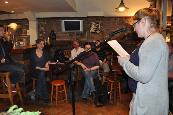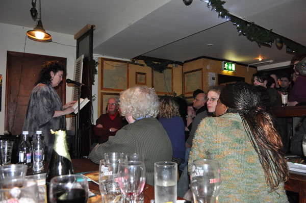 By 9:36 the packed pub rumbled with talk of days at work, abandoned poems, writing conferences, and novels in progress. The man in the green sweater introduced the evening’s emcee to the evening’s featured poet, Pauline Fayne. Surely we were about to begin. Then the emcee set her purse on my table, rolled a cigarette, and strolled outside. I nearly followed her, but stood my ground. Or sat it.