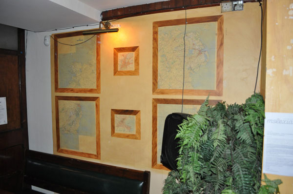 I am here to observe, I told myself as I took in the brick-walled room, here to learn. Ó Bhéal was the sort of event our open mic in Norman aspires to become: an indispensible weekly fixture on the local literary scene. Poets are my people. I belong here. Unconvinced, I searched the long, narrow room for a sign. Beneath the windows, a couple dozen books stood on display at the back of a bench. Above the books and between the windows, a pair of framed, yellowed maps hung on the brick wall. Lamps dangled from pulleys in the rafters. Aside from the young man with the crisps, no one knew I was there. I checked my watch. It was 9:17. If the sparse crowd taught me anything, it was that my local open mic’s low summer attendance was not an anomaly.