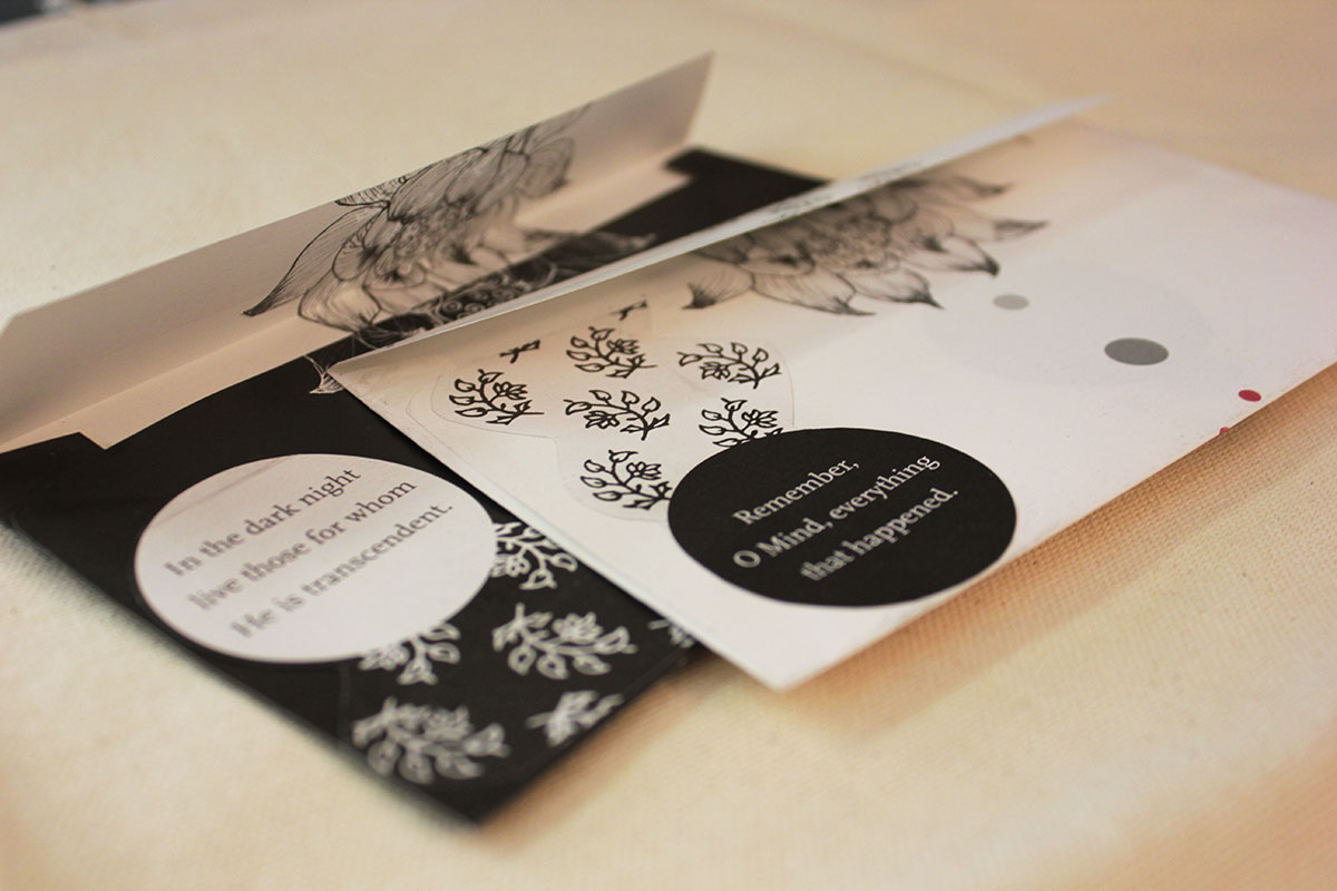 When I lifted the Isha Upanishad, translated by Pritish Nandy, off the bookshelves at the offices of World Literature Today, I was immediately drawn to this book for its particularly beautiful cover art by Sunandini Banerjee. I admit, I judge books by their covers sometimes. As I flipped through the pages, which smelled of rich ink and felt as firm as cardstock, my senses were doubly overtaken by the use of illustrations alongside the verses. This juxtaposition was a happy surprise. It felt as if it were, dare I say, the whole book experience. I was so charmed by this book that I decided to give it to a friend. At home, as I went to the printer to grab a blank white page to compose a letter to go along with it, I paused and made another impolite decision.