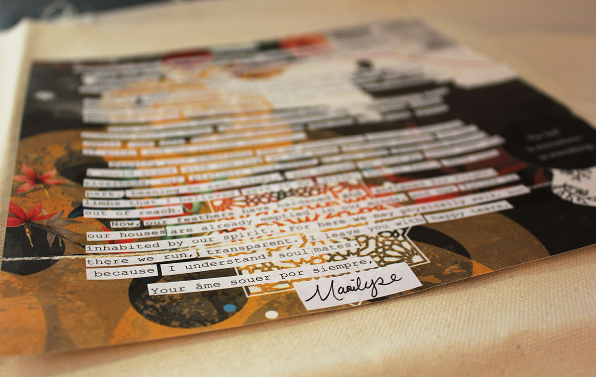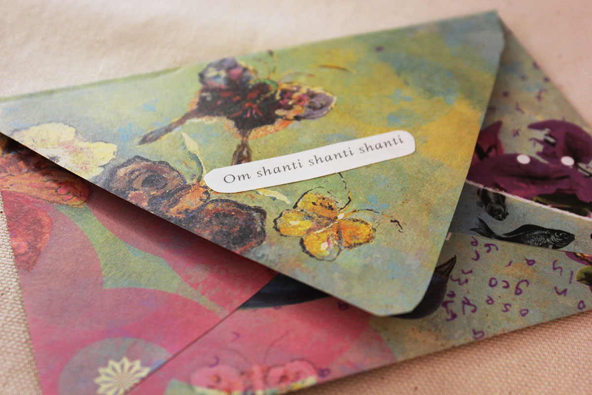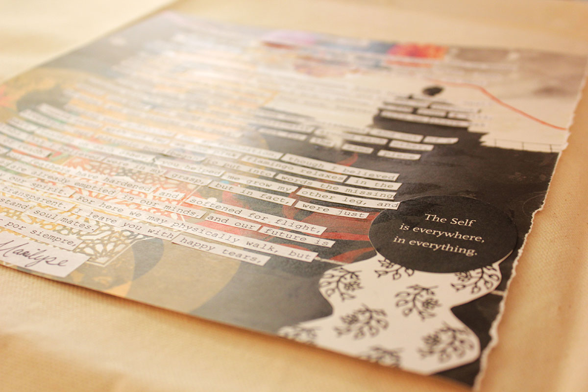 Like a sculptor, I took hold of the pages and squinted my eyes. I cut around the verses, put different parts of the poem together and took them apart again. The illustrations were not forgotten, and many images were either cut out and placed somewhere else or entirely covered up. Finally, I finished composing my letter out of the very book I thought would be a gift. I looked at the finished piece and marveled at the poems’ transformation. I began to wonder if the recipient of this parcel would recognize this as the Isha Upanishad, or a poem at all? I did not want to alter the meaning of the original work, though it appears impossible not to complicate this already twofold translation with another translation. But without knowing it, I had become a translator of translations.
