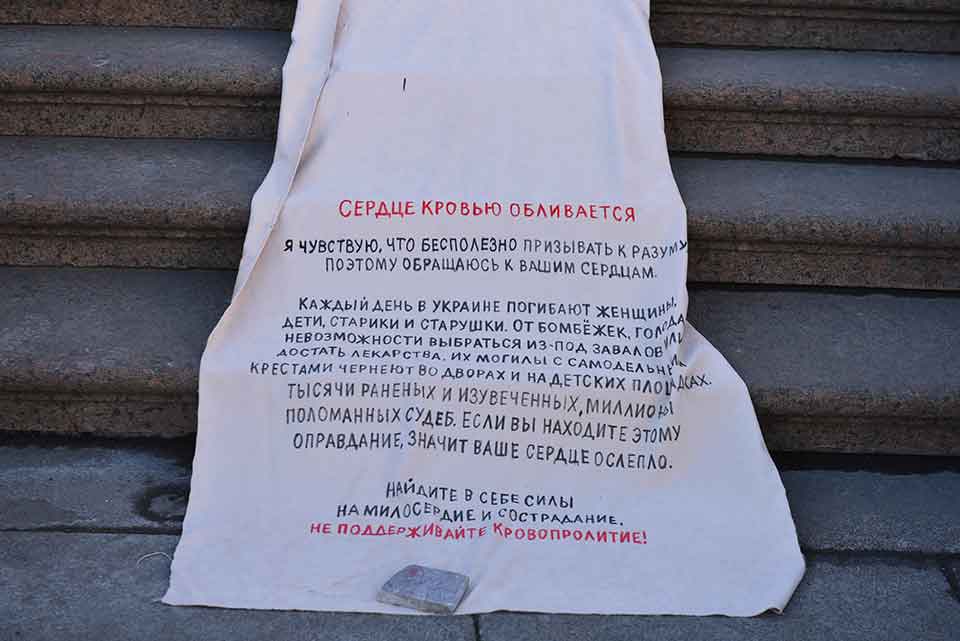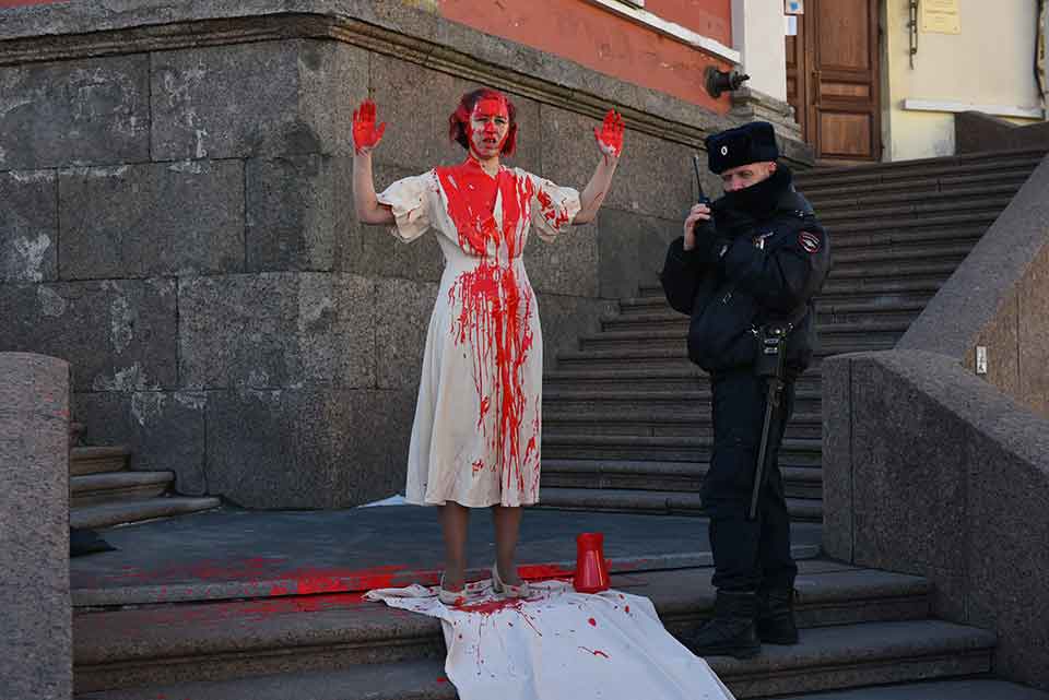 Citizen-activist Evgenia Isayeva doused herself with red paint as part of the “Heart Bleeds” action near the Duma Tower, St. Petersburg, Russia, March 27, 2022. Her banner reads: “My heart bleeds. /…